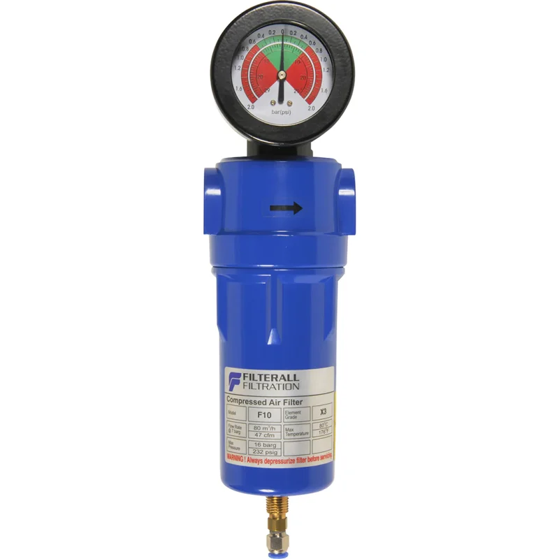 - Construction robuste : Corps en aluminium moulé sous pression (norme EN 1706) avec revêtement époxy résistant à la corrosion, cartouche filtrante en fibres de verre borosilicate avec média coalescent, durée de vie estimée >8000 heures en service continu.